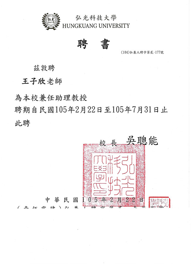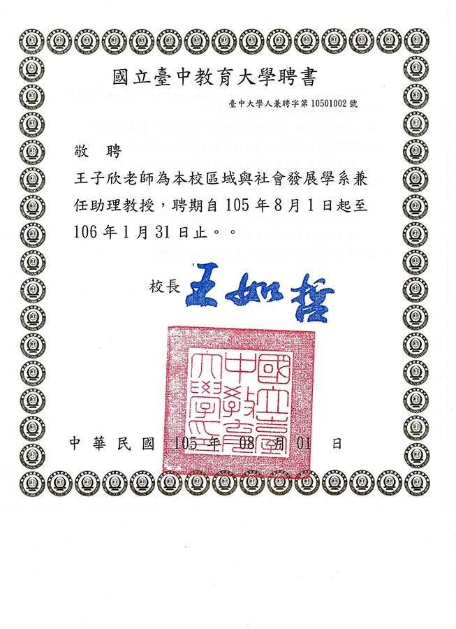 - 教育部 助理教授資格證書 (助理字第146761號)